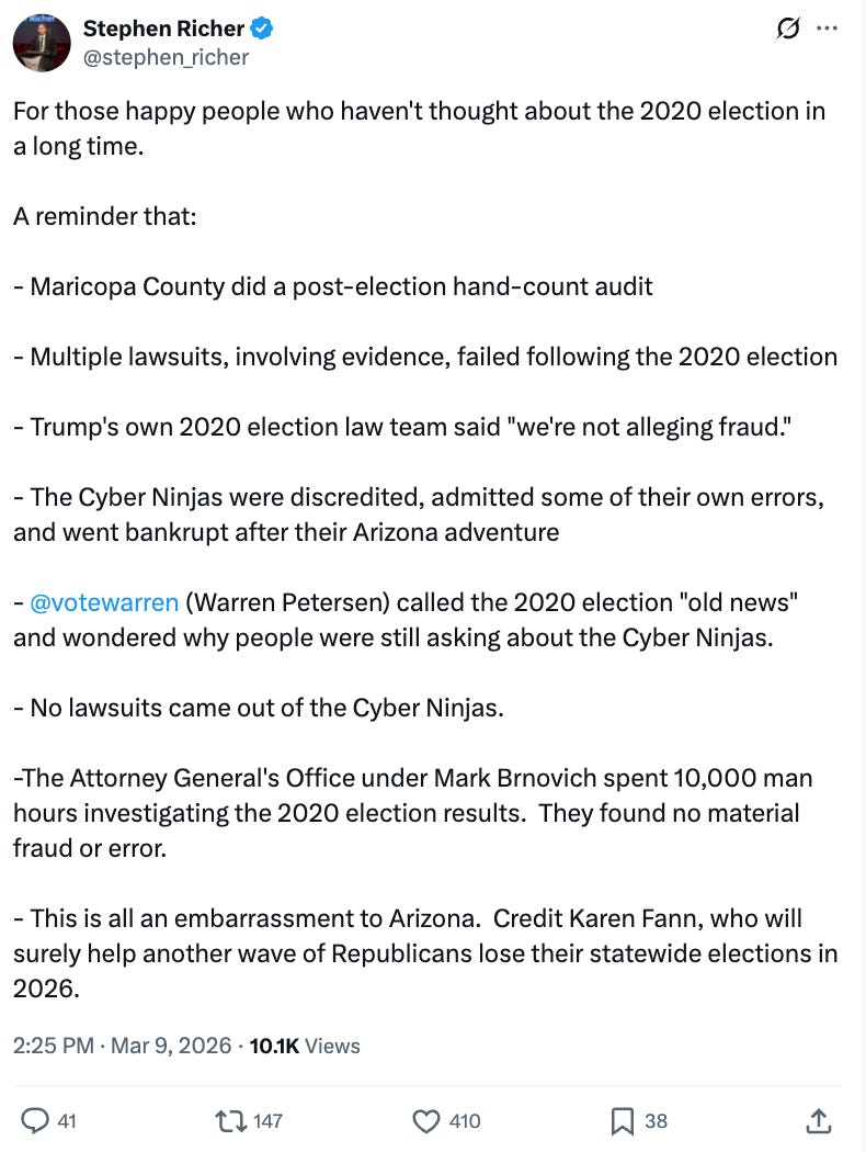 Former Maricopa County Recorder Stephen Richer, a Republican who served as recorder from 2021-2025 and had to deal with all the unhinged aftermath of Trump’s 2020 lies, posted a series of tweets a Monday amid reports of the subpoena, reminding people that “the Attorney General’s Office under Mark Brnovich spent 10,000 man hours investigating the 2020 election results. They found no material fraud or error.”