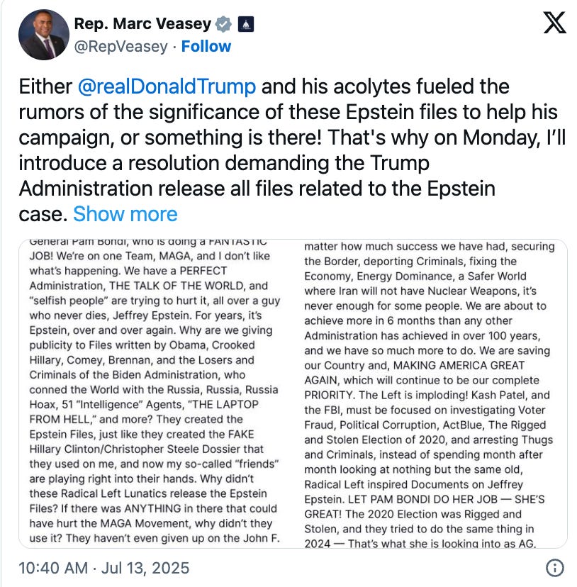 Some elected Dems are going further, with Rep. Marc Veasey (D-TX) announcing he would soon introduce a resolution that demands the Trump administration release all investigative files on Epstein.