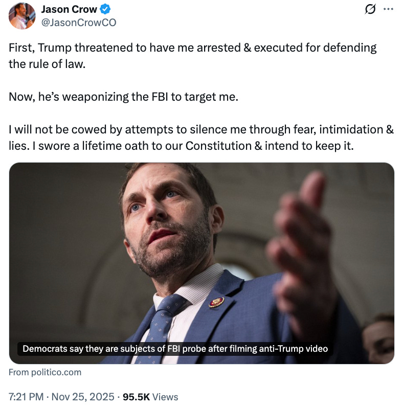 The video — which featured Sens. Elissa Slotkin (D-MI) and Mark Kelly (D-AZ), as well as Reps. Chris Deluzio (D-PA), Maggie Goodlander (D-NH), Chrissy Houlahan (D-PA) and Jason Crow (D-CO), all veterans of the military or former national security officials — set off an insane series of reactions by President Trump and Secretary of Defense Pete Hegseth, who have seized on the moment as an opportunity to carry out some of the retribution plans Trump’s been thirsting for since his first term. Trump even suggested on social media that the lawmakers should be punished with death by hanging. Hegseth is considering recalling Kelly into active service so he can be (baselessly) court martialed. The DOJ and FBI are conducting their own investigation into the lawmakers.
