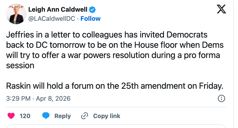Democratic leadership in Congress is planning a handful of actions to at least make some noise about President Trump’s ongoing, unauthorized and increasingly hysterical war in Iran, which may or may not be ongoing. While leadership did not join the chorus of calls from Democratic members of Congress yesterday to invoke the 25th Amendment and/or impeach Trump, Senate Minority Leader Chuck Schumer (D-NY) is planning to force a vote on a war powers resolution in the upper chamber next week.