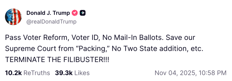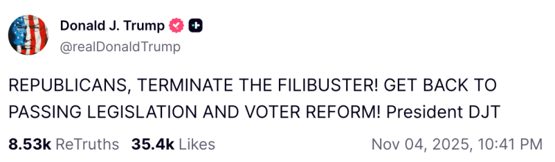 Trump Wants Filibuster Abolished in Wake of Election Losses