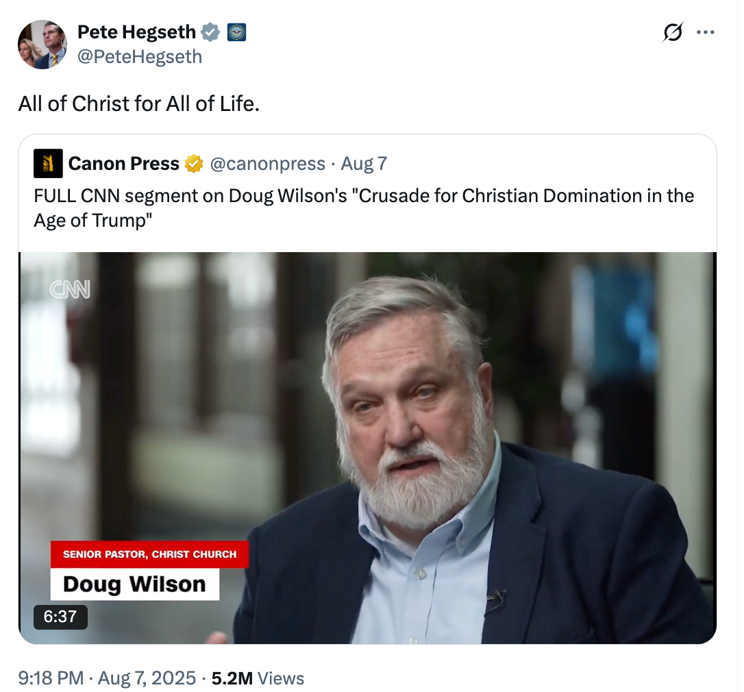 It’s a moderate amount of influence that might not be particularly exceptional for a regional religious movement were it not for one thing: Wilson can count members of the Trump administration — most prominently, Secretary of Defense Pete Hegseth — as devotees of his work, and as members of churches belonging to his denomination. As I first reported in May, Hegseth and Wilson met for the first time this year.