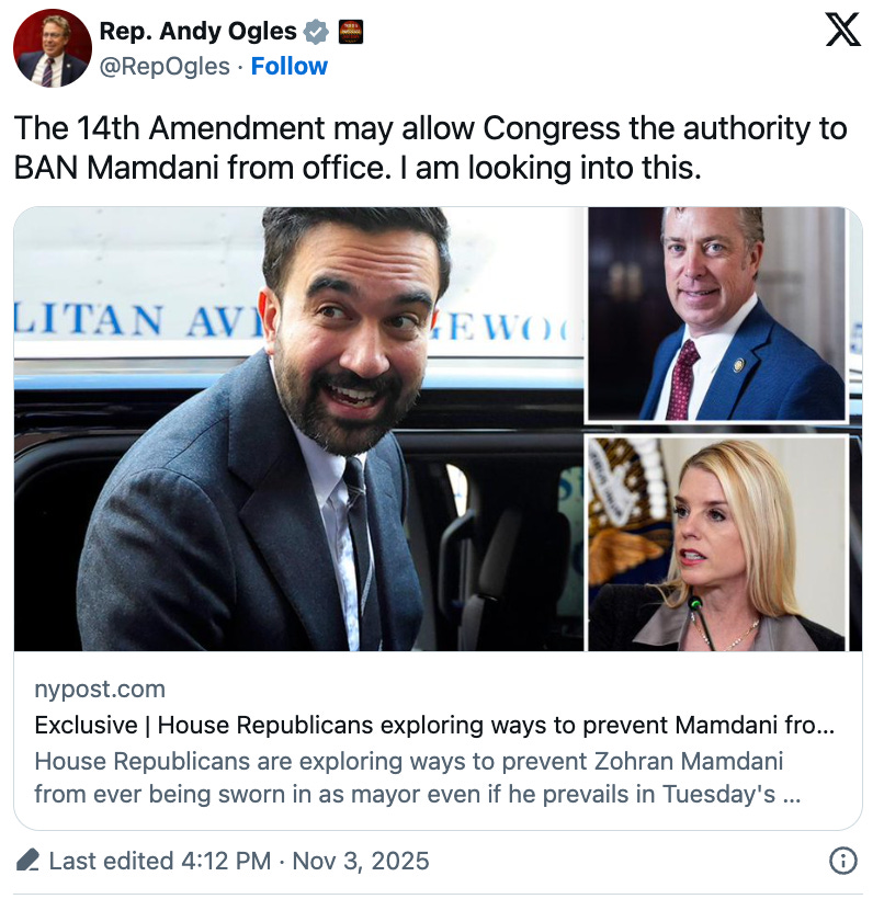 As the MAGA world and Fox News whips its viewers into an unjustified and Islamophobic frenzy over the potential election of Mamdani tonight, House Republicans and the New York Young Republican Club are seeking to legitimize those various right-wing efforts to demonize the insurgent candidate and actually block him from office. The New York Post published an article over the weekend, outlining the ways in which this effort is unfolding. Basically, Republicans think that they can prevent Mamdani from being sworn-in as mayor if they can get Congress to ban the 34-year-old candidate from taking office under the 14th Amendment, claiming that his activism, including calls to resist ICE, might fit within its prohibitions on officeholders who have “engaged in insurrection or rebellion” or who has “given aid or comfort to the enemies.”