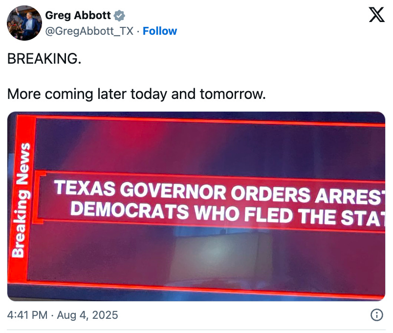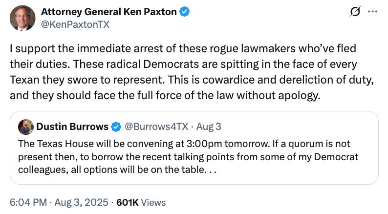 An hour later, he posted again, suggesting the “radical Democrats” — who fled the state to prevent their Republican colleagues from reaching a quorum during their special session to approve mid-decade redistricting maps — would be hit with the “full force of the law without apology.”