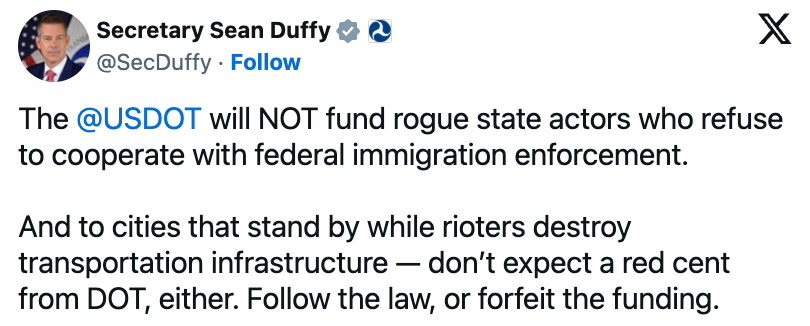 Here’s what Trump’s Secretary of Transportation Sean Duffy posted in response to the long Truth Social screed unpacked above. It appears to be an escalation of an earlier executive order in which the President called on administration officials to identify federal funding and grants to withhold from sanctuary states and cities.