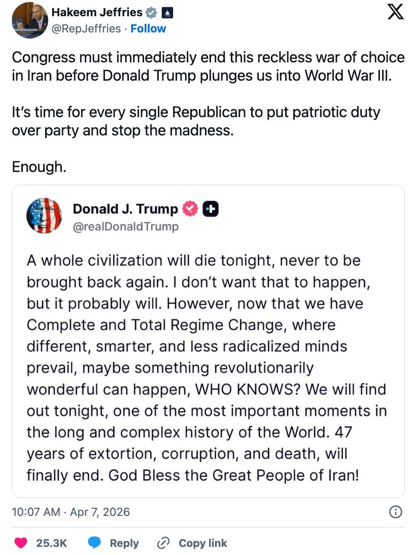 It’s not clear what tonight will bring. As my colleague Hunter Walker reported, Trump’s latest threats against the “whole civilization” of Iran and Iranian civilian infrastructure have helped grow the divide among the isolationists in Trump’s MAGA base who are not backing his actions in Iran, and other, more mainstream Republicans who are.