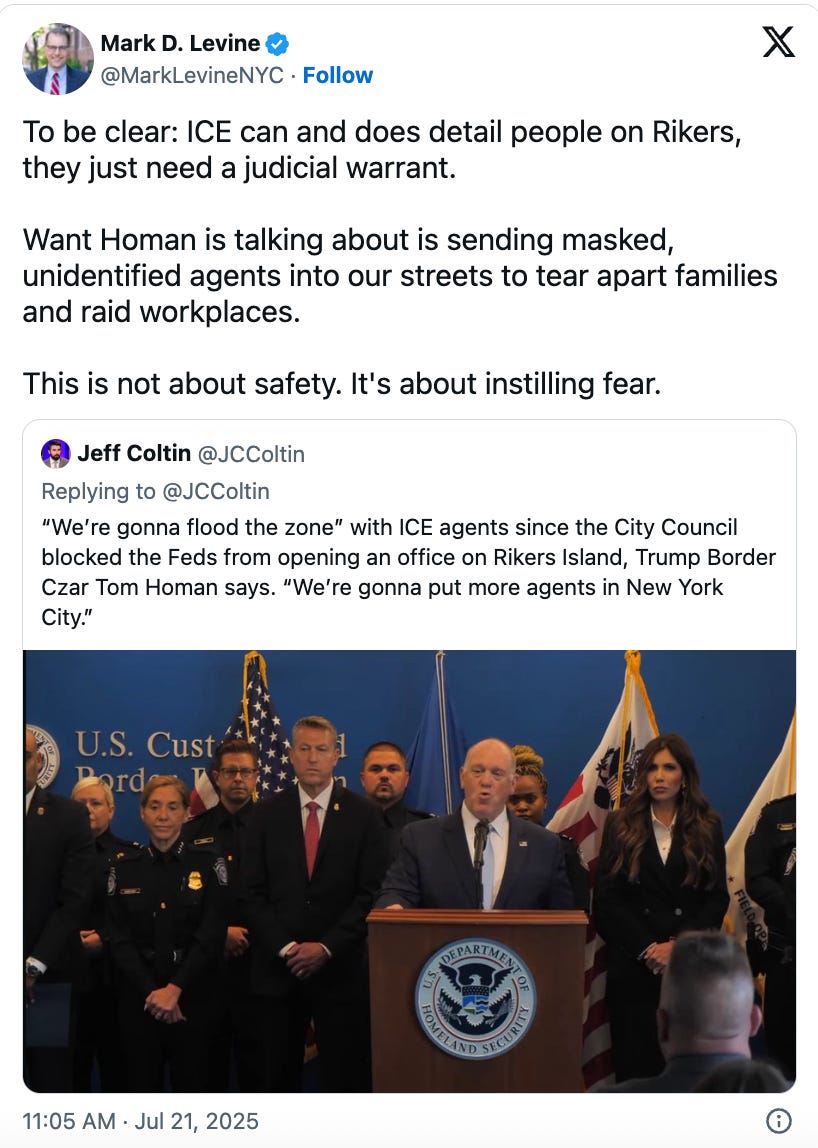 Trump administration Border Czar Tom Homan is out today warning that in retaliation, the Trump administration intends to “flood” the city with ICE agents conducting raids. Per Manhattan Borough President and Democratic nominee for comptroller Mark Levine: