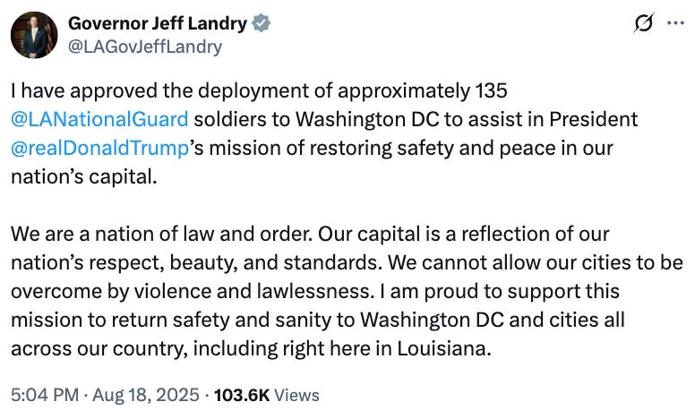 More red state officials are jumping on the bandwagon this week to send National Guard troops to D.C. to aid Trump in his takeover of the D.C. police force and military occupation of the nation’s capitol. It’s all a stunt to make Trump look tough on crime (violent crime rates are on the decline in D.C. and across the U.S.), while also giving him leverage to punish the city’s Democratic elected officials. In that way, it’s similar to the goals of the occupation in Los Angeles.
