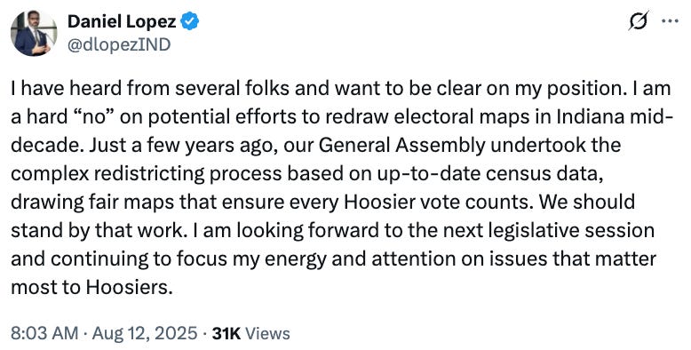 A handful of Republican state lawmakers in Indiana have come out against the Trump administration’s redistricting pressure campaign since President Trump sent his VP and a handful of White House officials to the state earlier this month. It was seen as an attempt to strong-arm Republican officials there into redrawing their congressional district maps — even though seven of Indiana’s nine U.S. House seats are already held by Republicans — as padding for Trump’s campaign to gerrymander/power grab his way towards keeping the GOP in control of the House in the midterms.