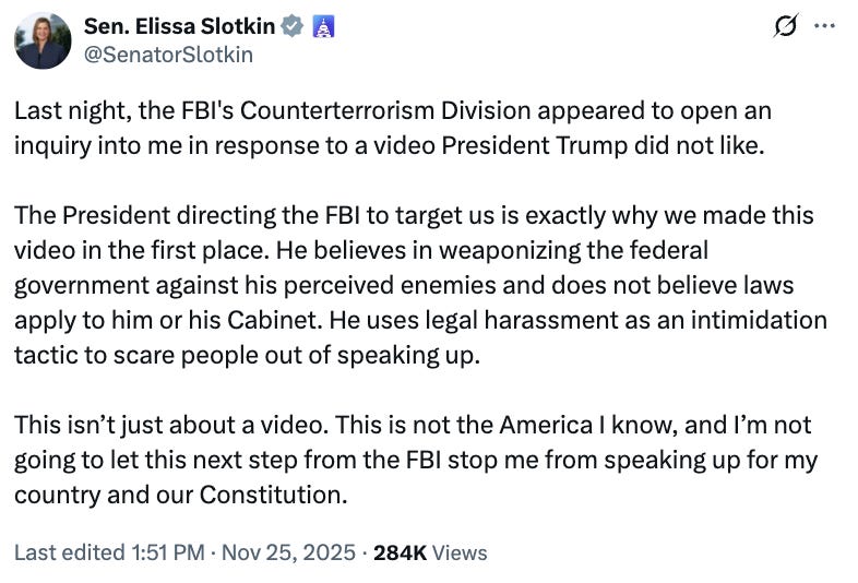 Slotkin confirmed the new reporting, saying Trump “directing the FBI to target us is exactly why we made this video in the first place.”