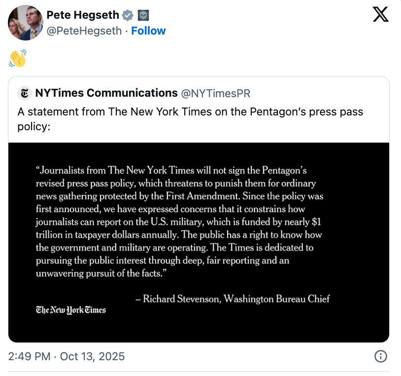 The new regulations are in line with Defense Secretary Pete Hegseth’s ongoing efforts to physically restrict journalists’ access to the Pentagon and to place limits on their reporting abilities in the building. More details on the new restrictions, per the Times: