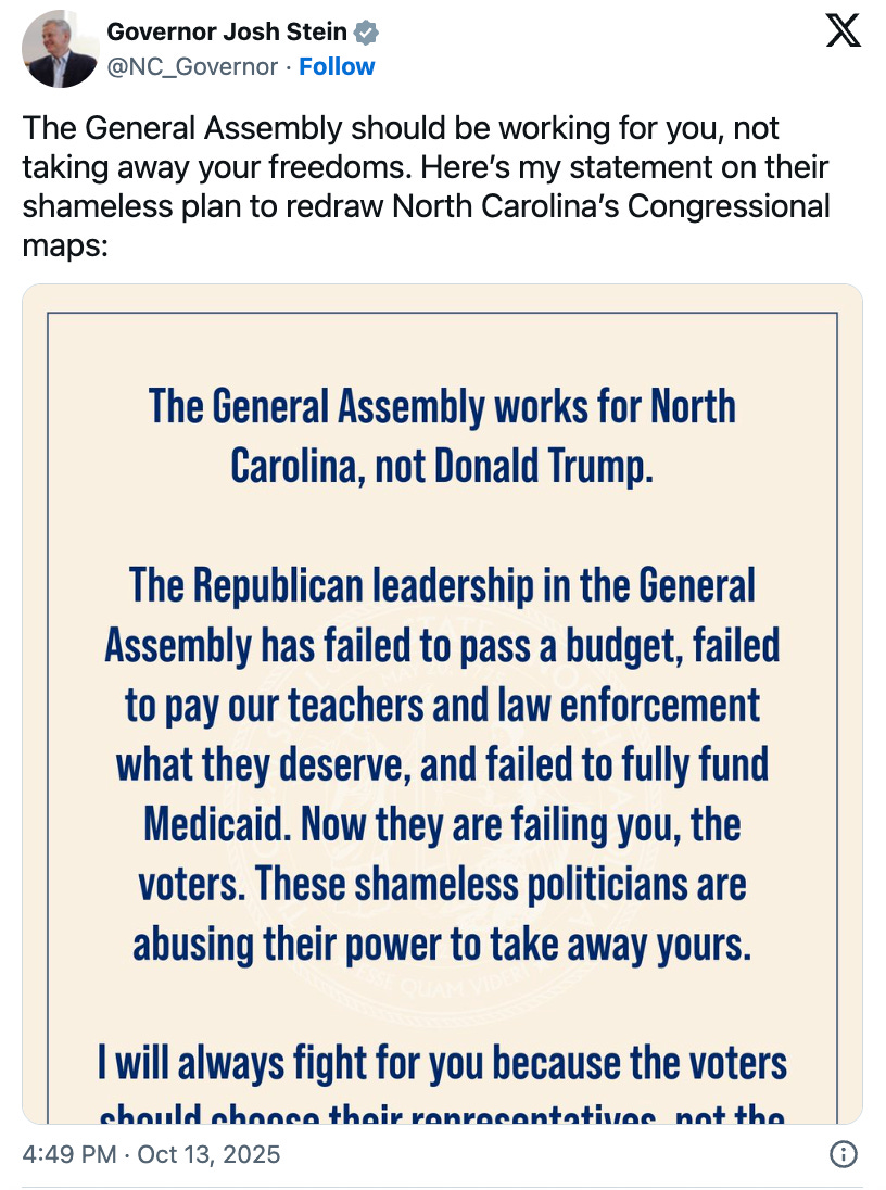 There’s little North Carolina Democrats can do to stop their Republican colleagues from acting on Trump’s nationwide gerrymandering directive. Republicans hold the majority in both the state House and Senate and lawmakers were already scheduled to return to the state Capitol for a legislative session on October 20. Additionally, redistricting plans are apparently not subject to the governor’s veto.