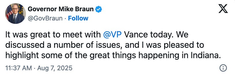 Reports from Indiana about the meeting did not exactly describe a ringing endorsement of the Trump administration’s ratfuckery. While a source in the meeting room told Politico that Vance “made a compelling case for what needs to be done,” Republican Gov. Mike Braun told reporters after the meeting that they talked about “a wide array of topics.”